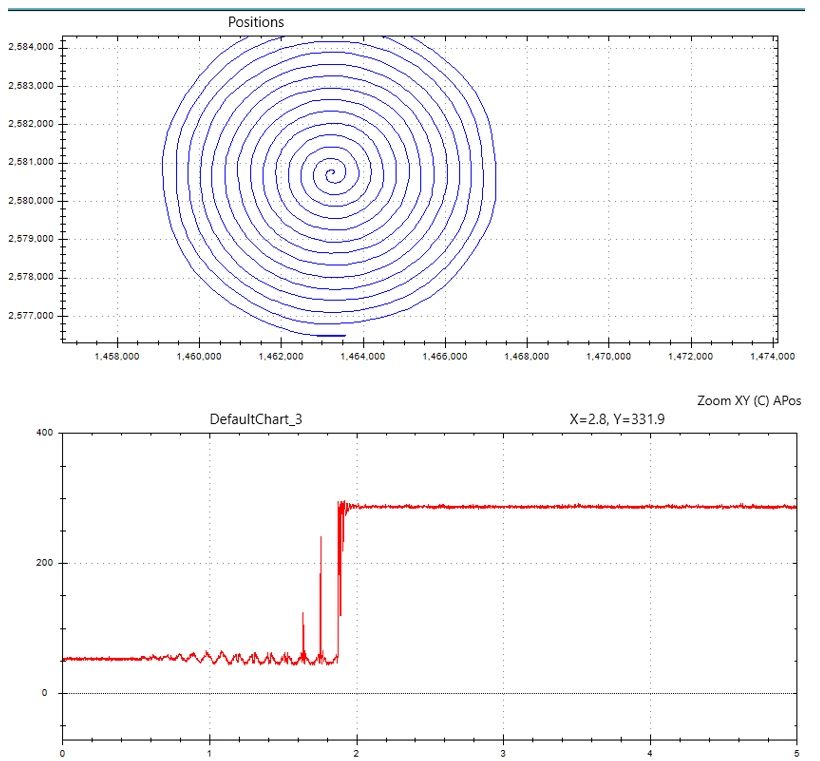 高速螺旋線(xiàn)軌跡屬于定制算法單軸移動(dòng)采樣的特殊應用,實(shí)際運行中根據工藝距離不同完成螺旋時(shí)間1.2-2s。由于封裝在DSP中執行,其運行效率顯著(zhù)優(yōu)于普通程序任務(wù)的執行。