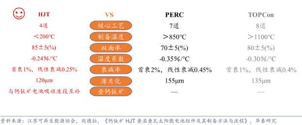 HJT電池結構獨特,量產(chǎn)平均轉換效率優(yōu)于PERC與TOPCon,尤其在雙面率、溫度系數、衰減率低等方面表現更優(yōu)。