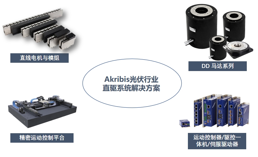 Akribis憑借在光伏行業(yè)多年的技術(shù)沉淀、研發(fā)定制等優(yōu)勢,提供完整的光伏行業(yè)直驅自動(dòng)化產(chǎn)品解決方案,包含自動(dòng)化控制系統、直線(xiàn)電機、DD馬達以及各種精密運動(dòng)平臺等。產(chǎn)品線(xiàn)覆蓋范圍廣,產(chǎn)品兼具高速、高加速度、高推力、運行時(shí)低噪音、免維護等特點(diǎn),并且擁有多種冷卻方式,可以顯著(zhù)提升機械的性能指標。